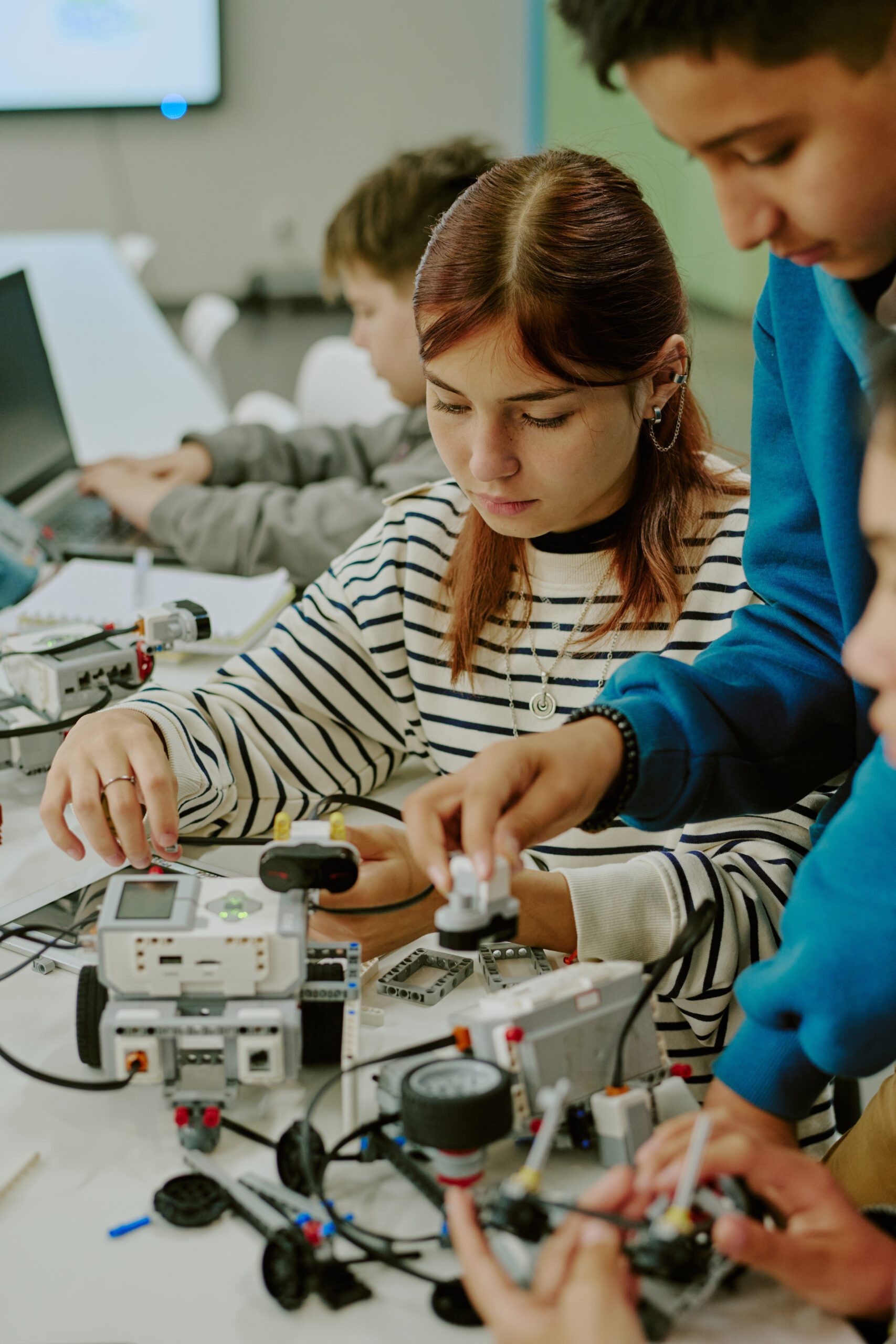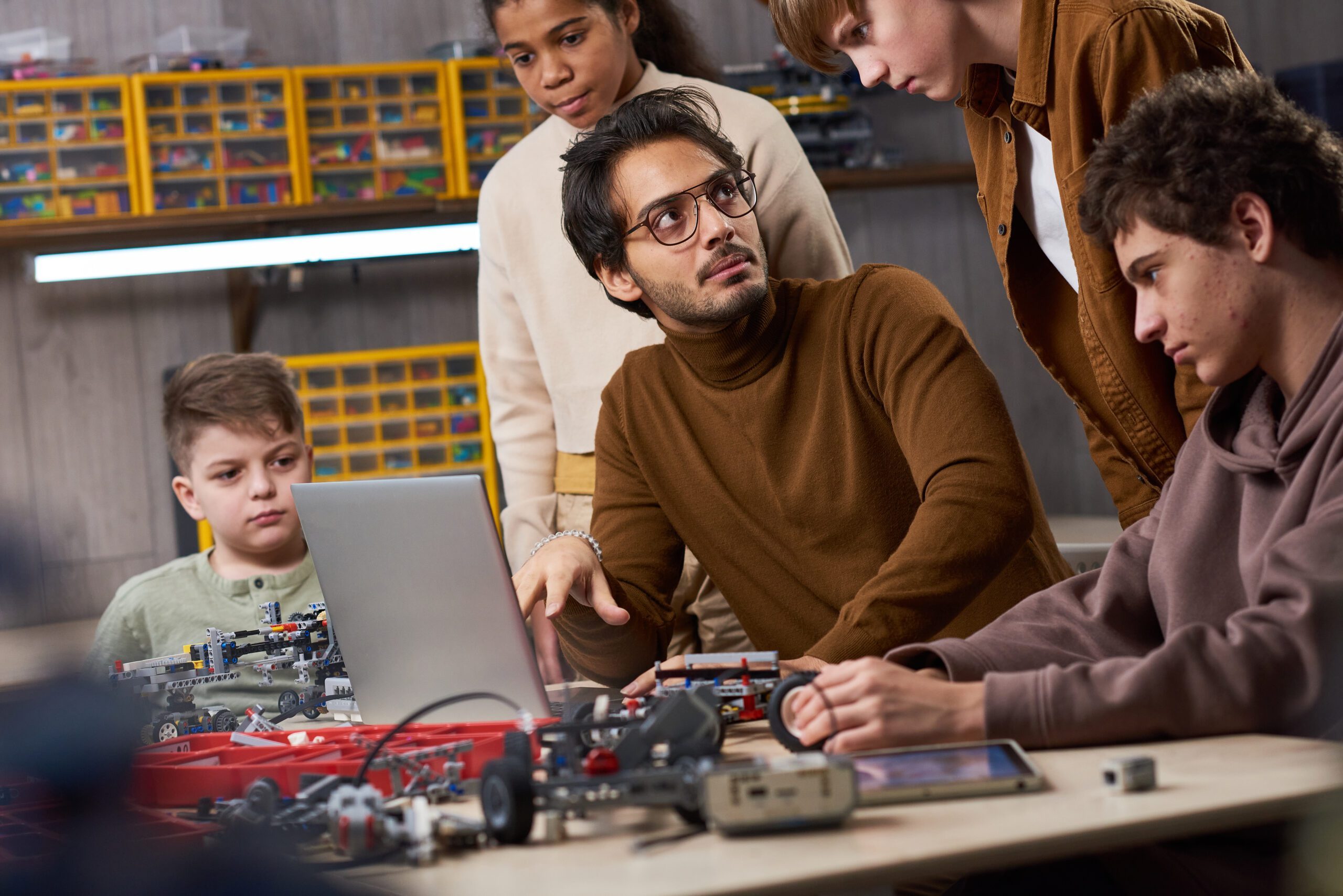 Group of young people doing experiments in robotics in a laboratory